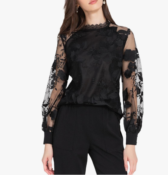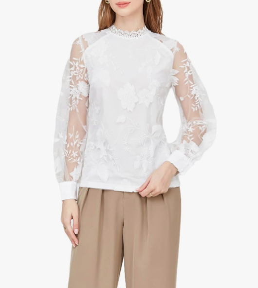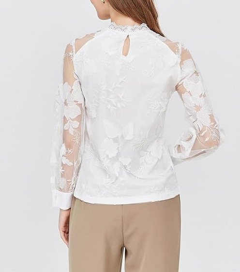 The lace is very pretty, and it is a cute shirt overall. In addition, the cuffs are also comfortable. The fabric is comfortable and easy to wear. It is suitable for going out or business. Even on hot days, the cuffs can be turned into lace, so it is suitable for sun protection. The lace pattern is breathable, and it has an inner lining, so you can wear it safely and easily enjoy your own stylish tulle shirt.