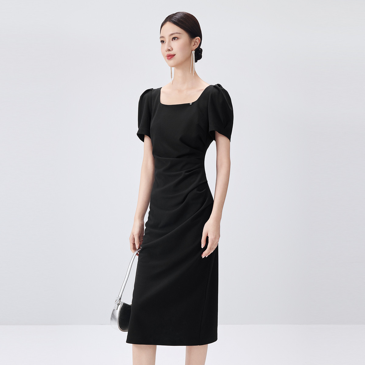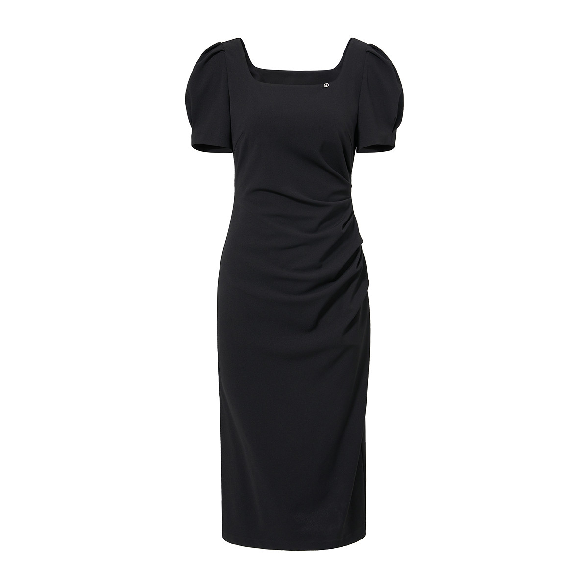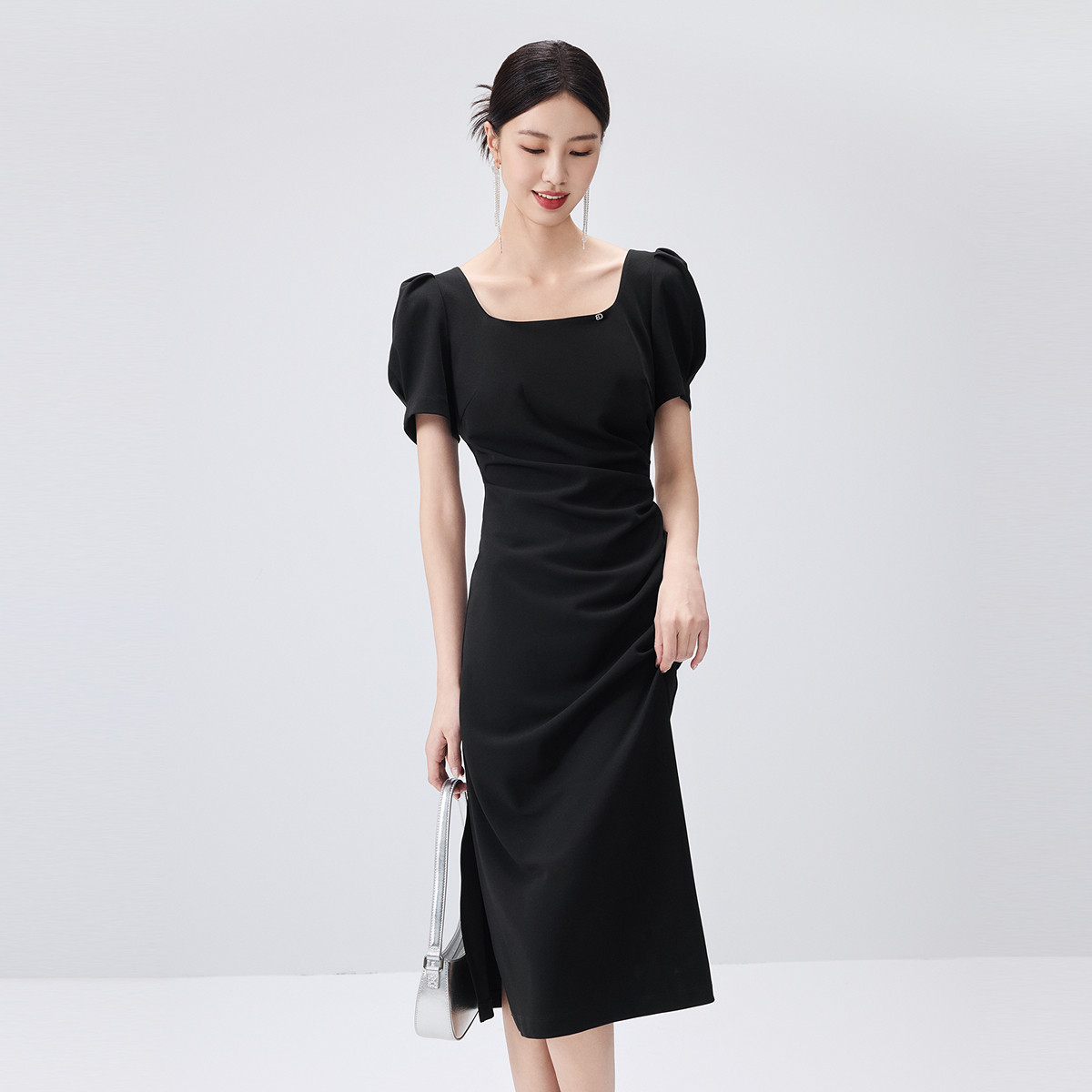 • Summer new elegant temperament pleated waist design square neck short-sleeved little black skirt slit dress