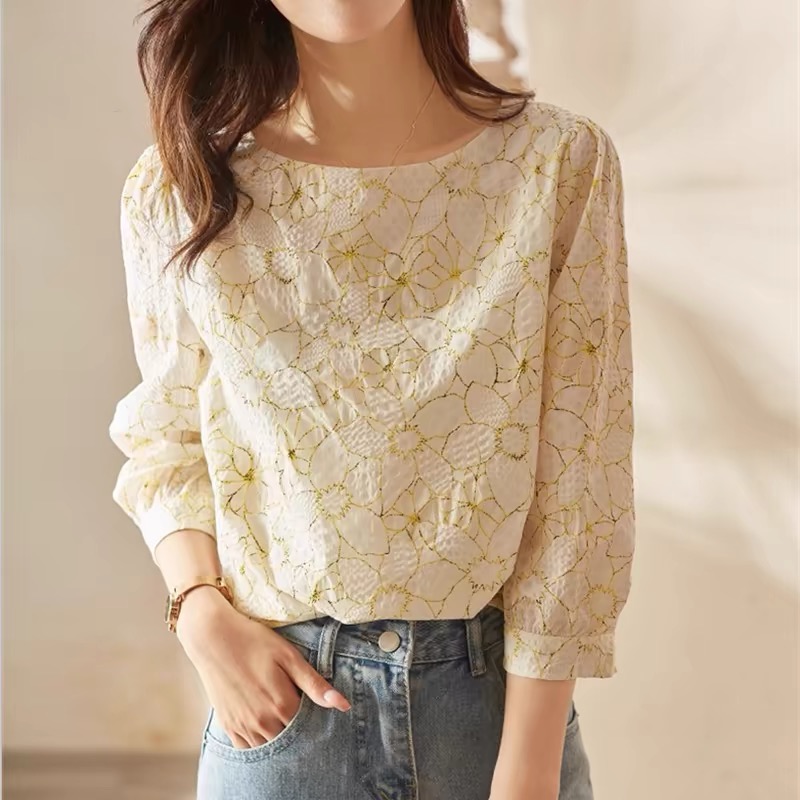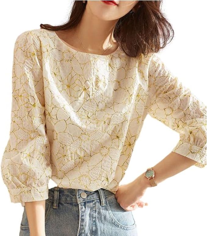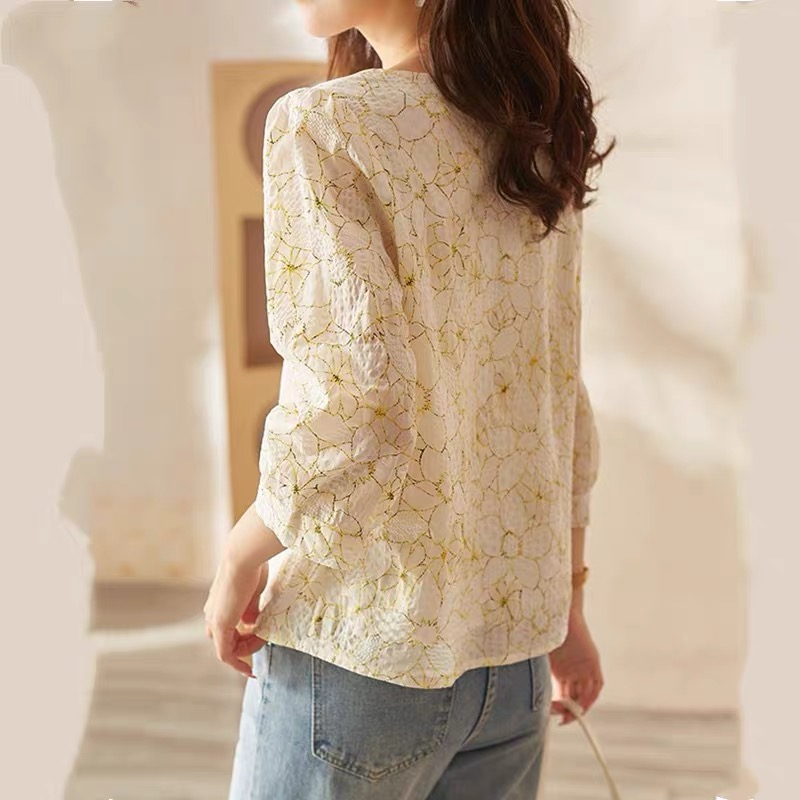 Made of soft cotton and polyester, it is breathable and easy to care for. The fluffy, soft and smooth bumpy texture makes the shirt feel comfortable. The slightly transparent, delicate ivory fabric and the gentle cream-yellow flower print exude a gentle and gorgeous feeling. The front and back are lined, so you don't have to worry about the lining and can enjoy the see-through feeling.