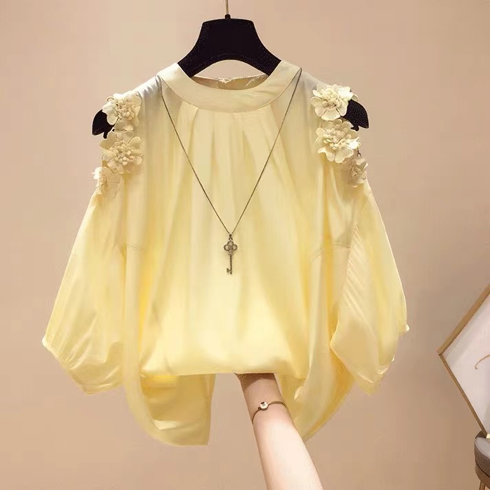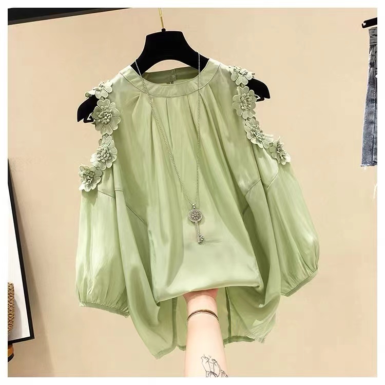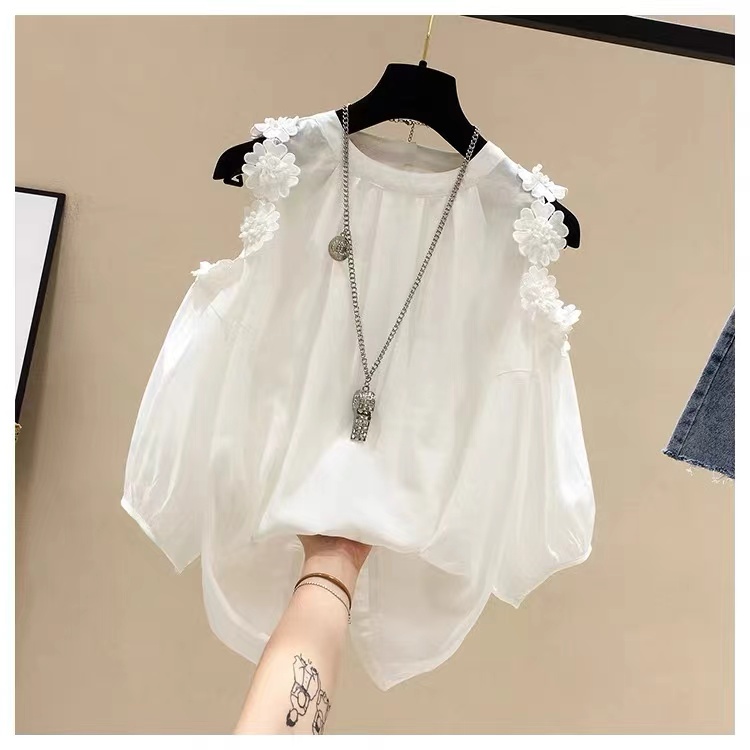 • Women's 3D floral off-shoulder half sleeve chiffon shirt